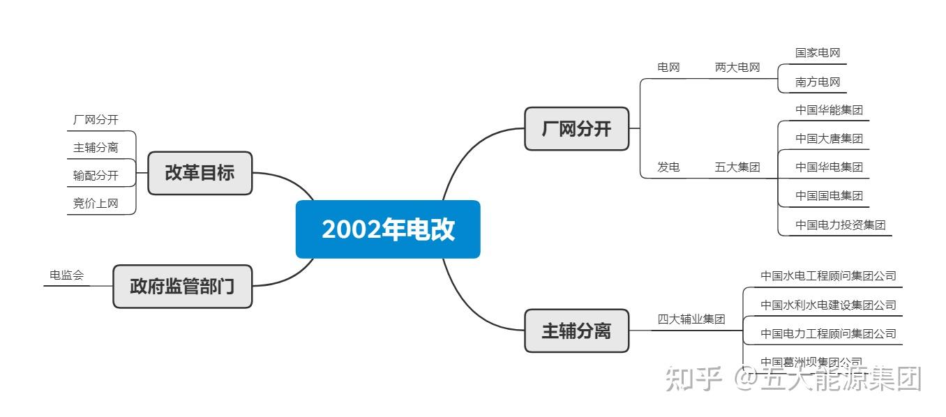 2002年,国务院印发《电力体制改革方案》,提出对原国家电力公司进行厂网分离,分离辅助性业务单位,并设立电监会。(即电改)
