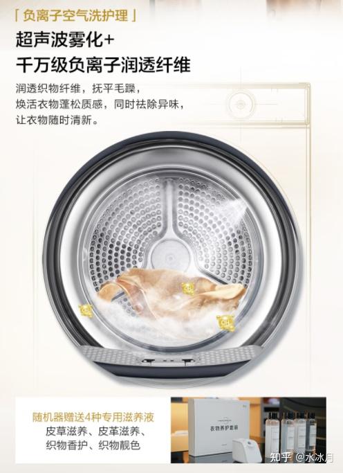 千万级 负离子 + 云感射频舱 内超声波雾化下除皱、除尘、除味、杀菌的同时,7种面料可选择, 抚平毛躁除静电外, 再加上真丝、皮革、皮草、织物保养四个 专属滋养液 深度养护。是海尔 最为高级的空气洗。