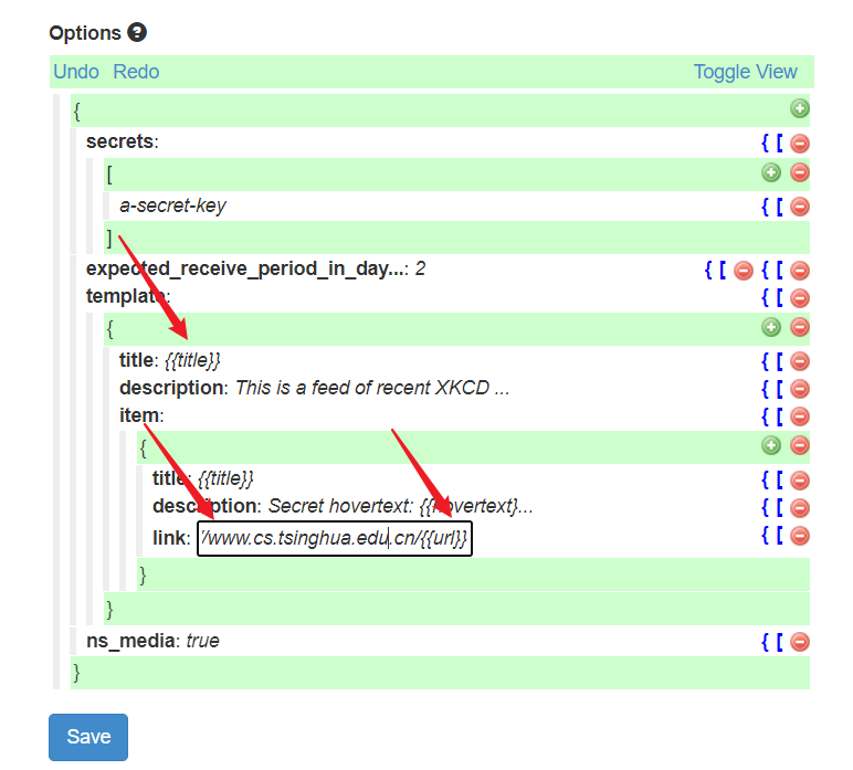 - 这里的语法是用{{}}把上一个agent得到的变量括起来进行输出,需要注意的是之前获得的每一条通知的链接是 ../info/1087/3380.htm 这种类型的,不是完整的网址,所以我们在这里需要对它进行如下的网址组合