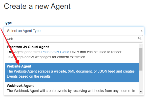 - 初始化已经有一些Agents,你可以从里中学习到一些使用方法。点击+ New Agent添加第一个Agent,Type选择 Website Agent 。