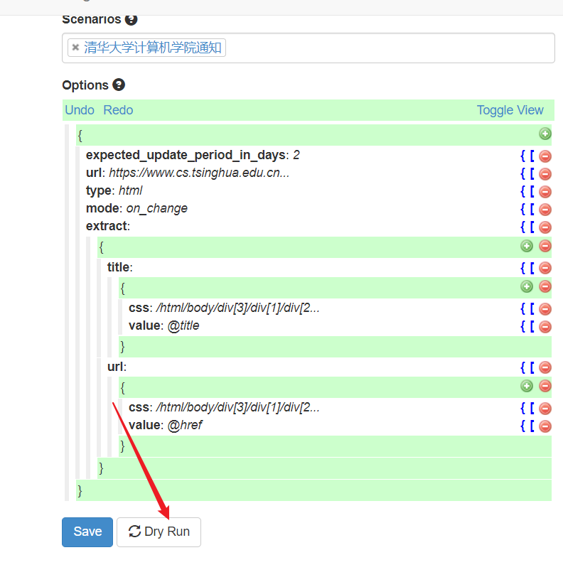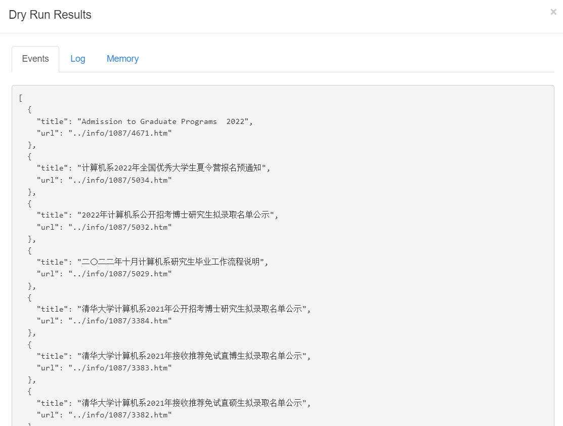 - 完成上面的配置之后,点击“Dry Run”,你就可以预览抓取结果了。注意到“事件”中看到抓取了结果,就表示该Website Agent设置成功了。