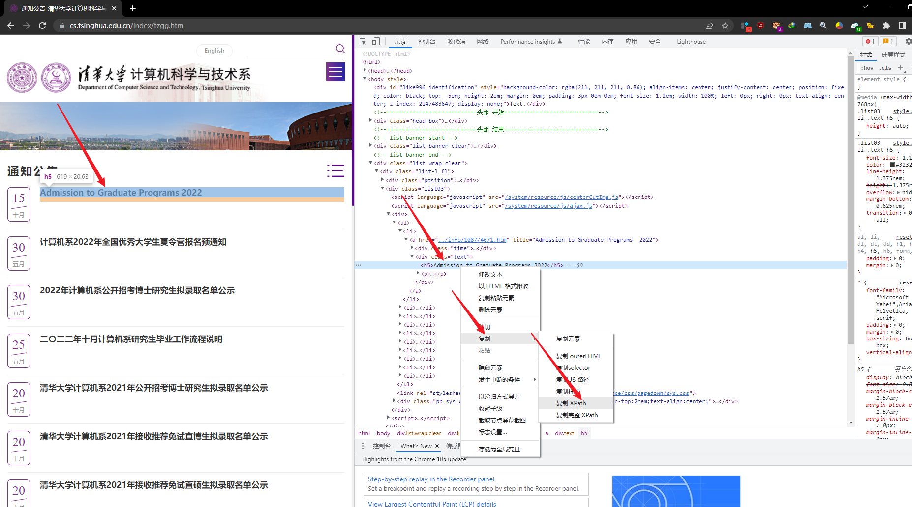 - 关于获取网页的Xpath的方法,直接使用火狐浏览器 (这里有个坑,是其他教程上都没有提到的,就是应该使用 火狐浏览器 而非谷歌浏览器,来抓取这个Xpath,这样更不容易出错),右击我们要获取的内容,然后选择“ 审查元素 ”,再到控制面板右击,选择复制 Xpath 。例如清华大学计算机学院通知的最新文章的url的Xpath是:/html/body/div[4]/div[1]/div[2]/div/ul/li[1]/a/div[2]/h5。
