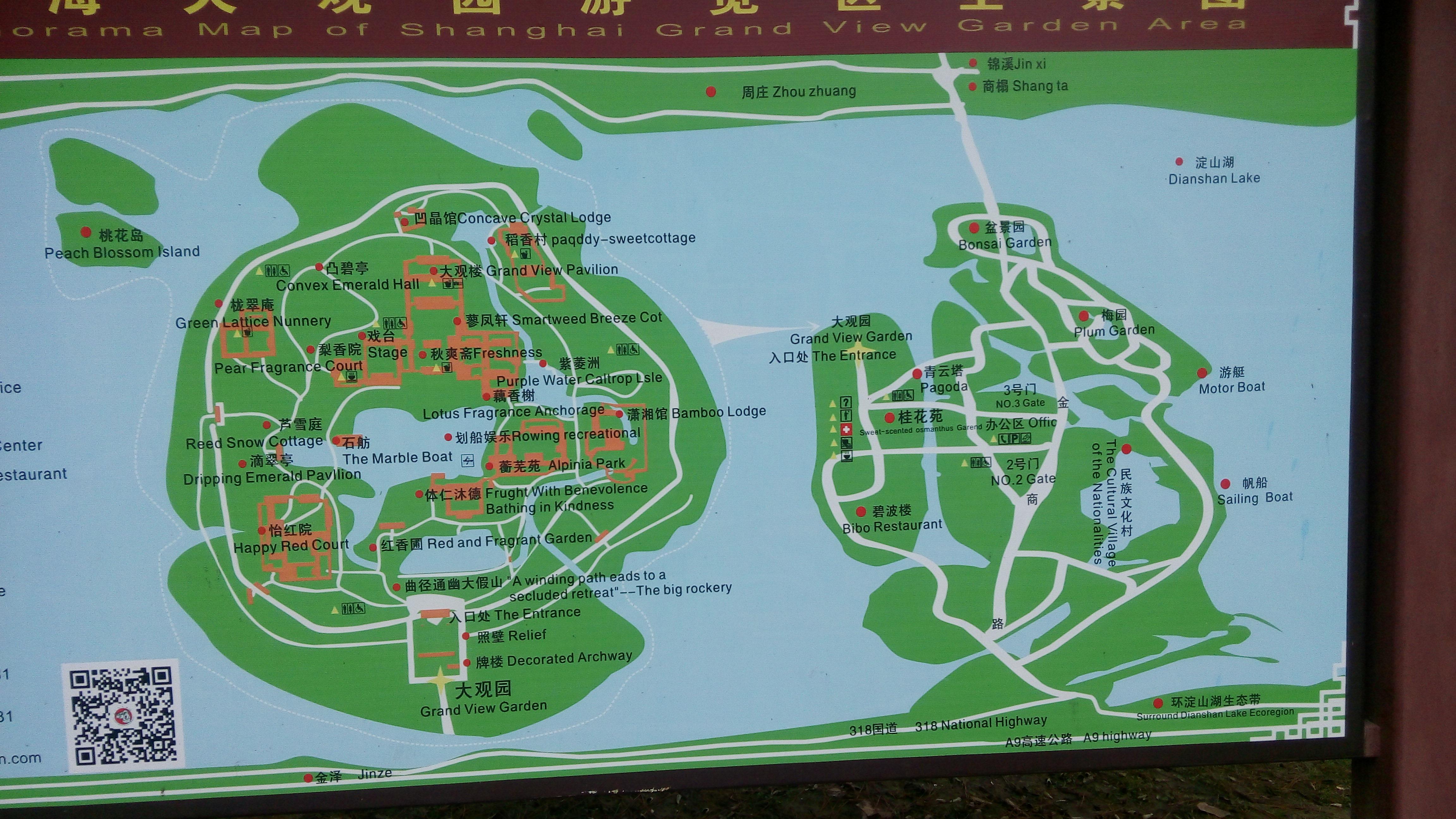从导游图上,第一观感还是水系偏差。个人觉得,园中置湖,最早大概是红学家们对大观园的误解。史大妹子说:“寒潭渡鹤影”,所以,园子里只有一个不大的水潭。当然置湖还有一种可能是经济方面的考虑:划船是可以收费的。
