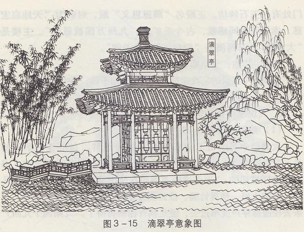 “亭子四面局势游廊曲桥,盖造在池中水上,四面雕镂槅子糊着纸。”书中滴翠亭是潇湘馆附近的一座水中之亭,实景却与潇湘馆相隔甚远,而近于怡红院。不过单论外形,实景图与意象图,简直就是一样一样的啊。