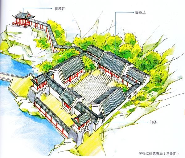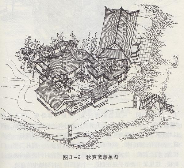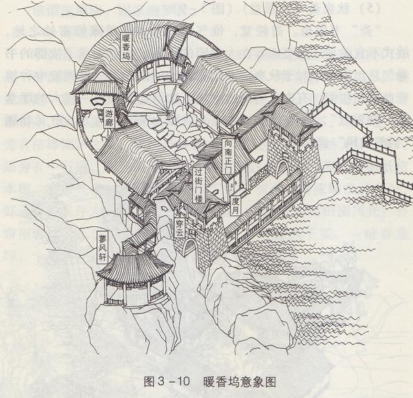 所以,暖香坞窝在山坳里,而蓼风轩挑在高处。坞所处的封闭地势,也大致折射出主人贾惜春的避世情结。书中关于惜春住处有三种说法,入园的时候说是蓼风轩、结社的时候又道是藕香榭。窃思无论轩榭,均为开敞建构,是无以安寝的。所以,此二处应该都是暖香坞的附属建筑。
