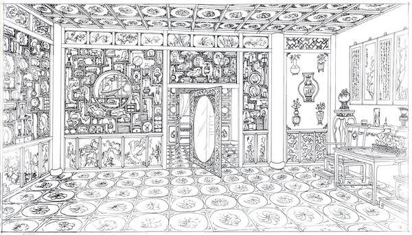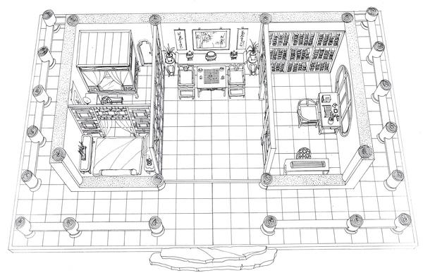 旁边有书房等几间小室,摆放书桌博古架。