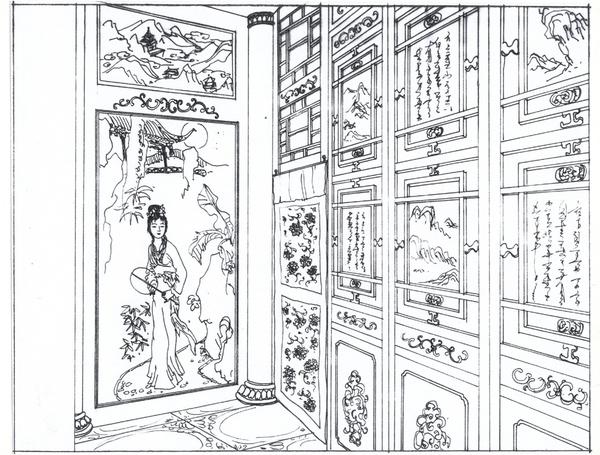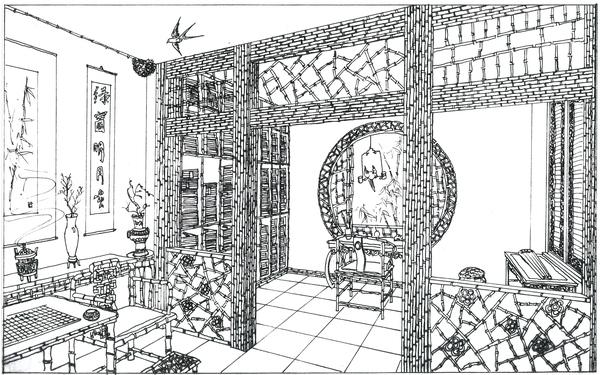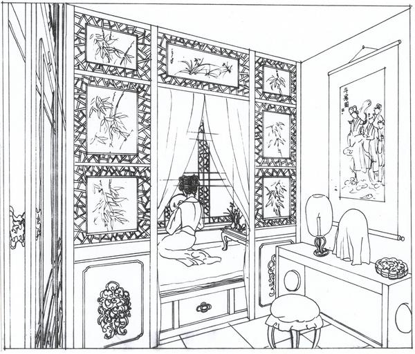 本图是从后院的视角看潇湘馆,大门在前端。从院外就可见一带粉垣,内里数楹修舍,为千百竿翠竹遮映。入得门来,便是曲折游廊,翠竹掩映,婆娑玉立;阶下石子漫成甬道,竹影参差,苔痕淡浓。上面小小三间房舍,一明两暗。主房后面便是花园,自紫菱洲分出的一股沁芳溪流由此灌入墙内,绕阶缘屋至前院,再盘旋竹下而出,穿过翠嶂汇入溪主流。后院游廊连接着两间小小退步,乃是闲时茶弈休憩佳处。宝玉也有一诗《有凤来仪》: