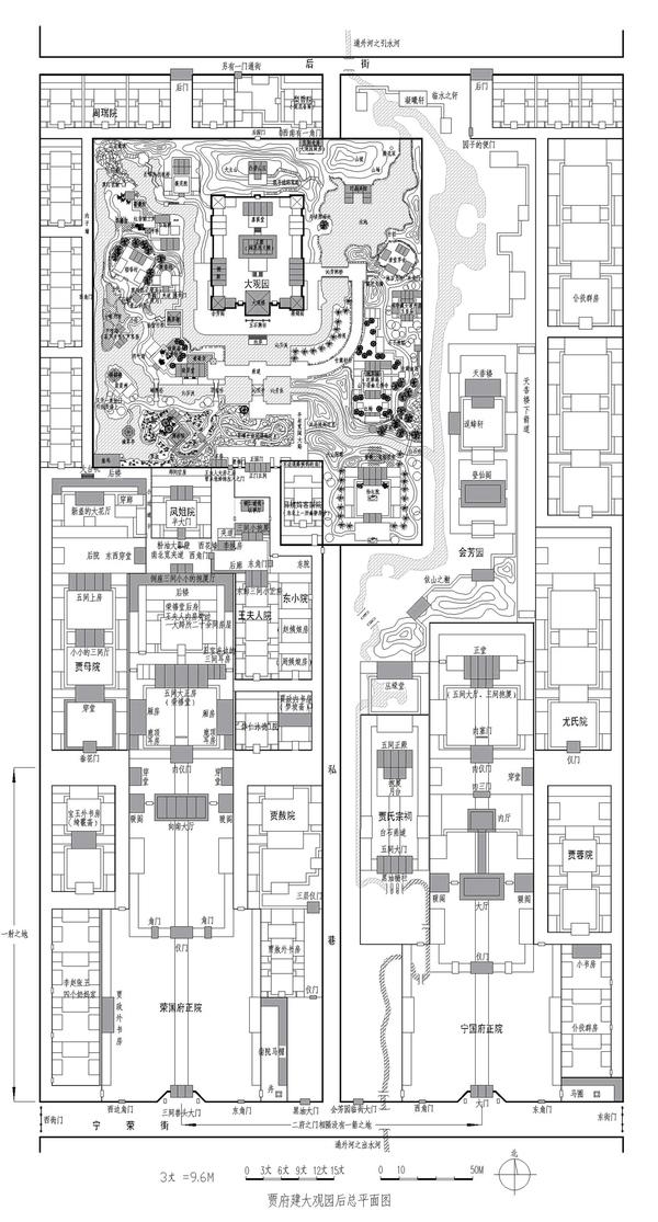 书中有言,那宁荣二府的大门,大略是一箭之地。一箭之地大致为130到150步,每步5尺,乾嘉时每尺为0.31米,如此算来,一箭之地约为200多米的样子。所以,比照上图的两府大门距离,我们大致可以估出,大观园的宽度约300米,长度约500米。这一圈算下来,周长大概有1600多米。考虑到现在的市里比明清时代的里稍长,这长度与第十六回里贾蓉所说“从东边一带,借着东府里花园起,转至北边,一共丈量准了,三里半大……”是吻合的。