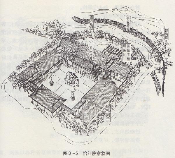 院外绕过碧桃花,穿过竹篱花障编就的月洞门,踏过沁芳溪上的白石板桥,就见粉墙环护,绿柳周垂。院内两边都是抄手游廊相接。院中点衬几块山石,东边种着数本芭蕉,西边乃是一棵西府海棠,其势若伞,丝垂翠缕,葩吐丹砂。那边有两只仙鹤在松树下剔翎。一溜回廊上吊着各色笼子,各色仙禽异鸟。上面小小三间抱厦倚着五间主房,一色雕镂新鲜花样隔扇,悬着一块匾额,上书四字道是“怡红快绿”。后院是满架的蔷薇、玫瑰和宝相花,沁芳溪在这里汇合流出大观园。宝玉自题《怡红快绿》诗云: