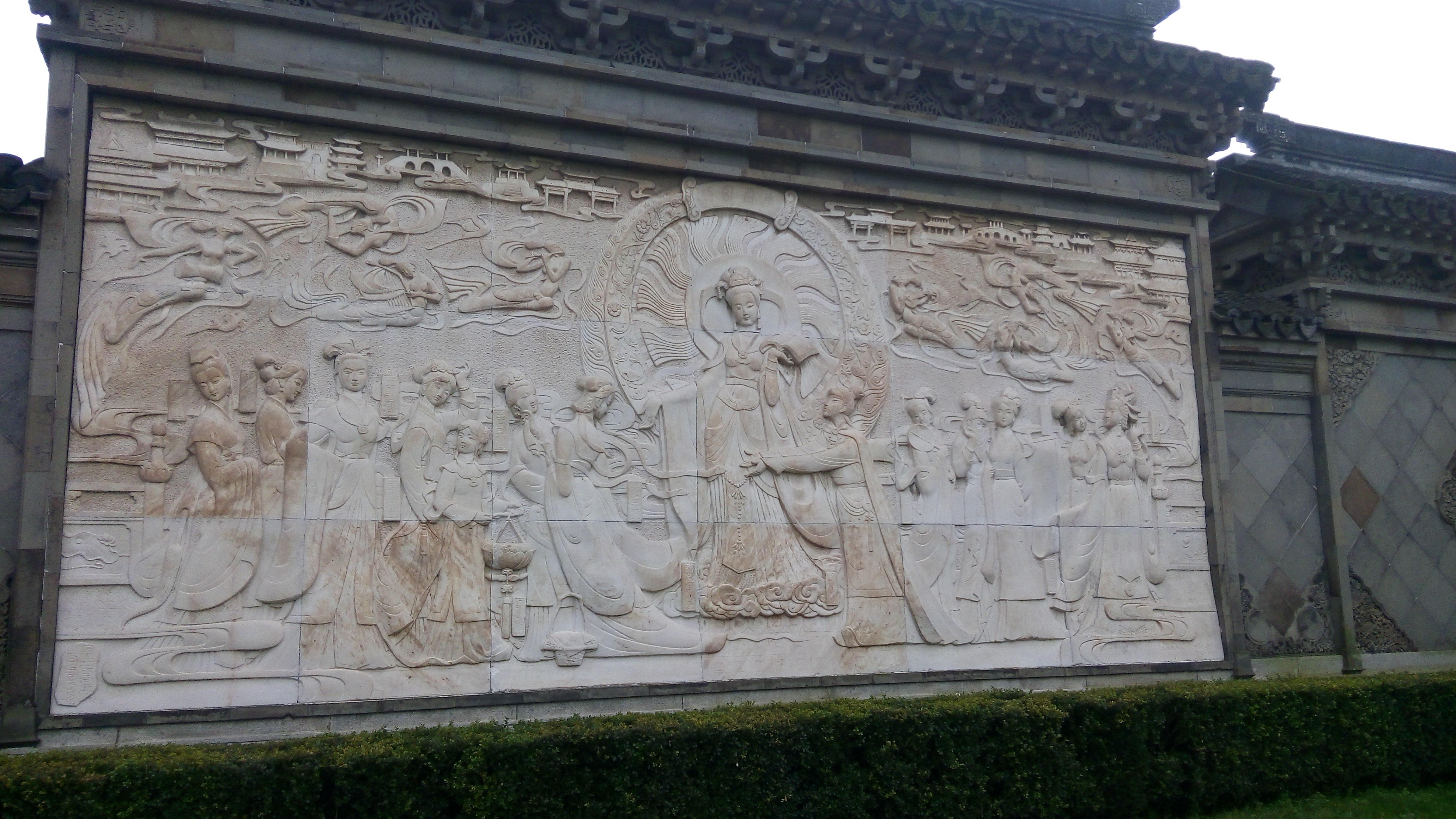 各种塑像网上多有,不赘。塑像的通病是黛玉和宝钗的脸型差不太多,不够分明。园子里没有湘云的居处,唯这里有个醉芍药的塑像,可惜太差啦!湘云虽然豪迈也不至于平躺吧,而且是躺在平板石桌子上,太没意境。太丑无颜上图!