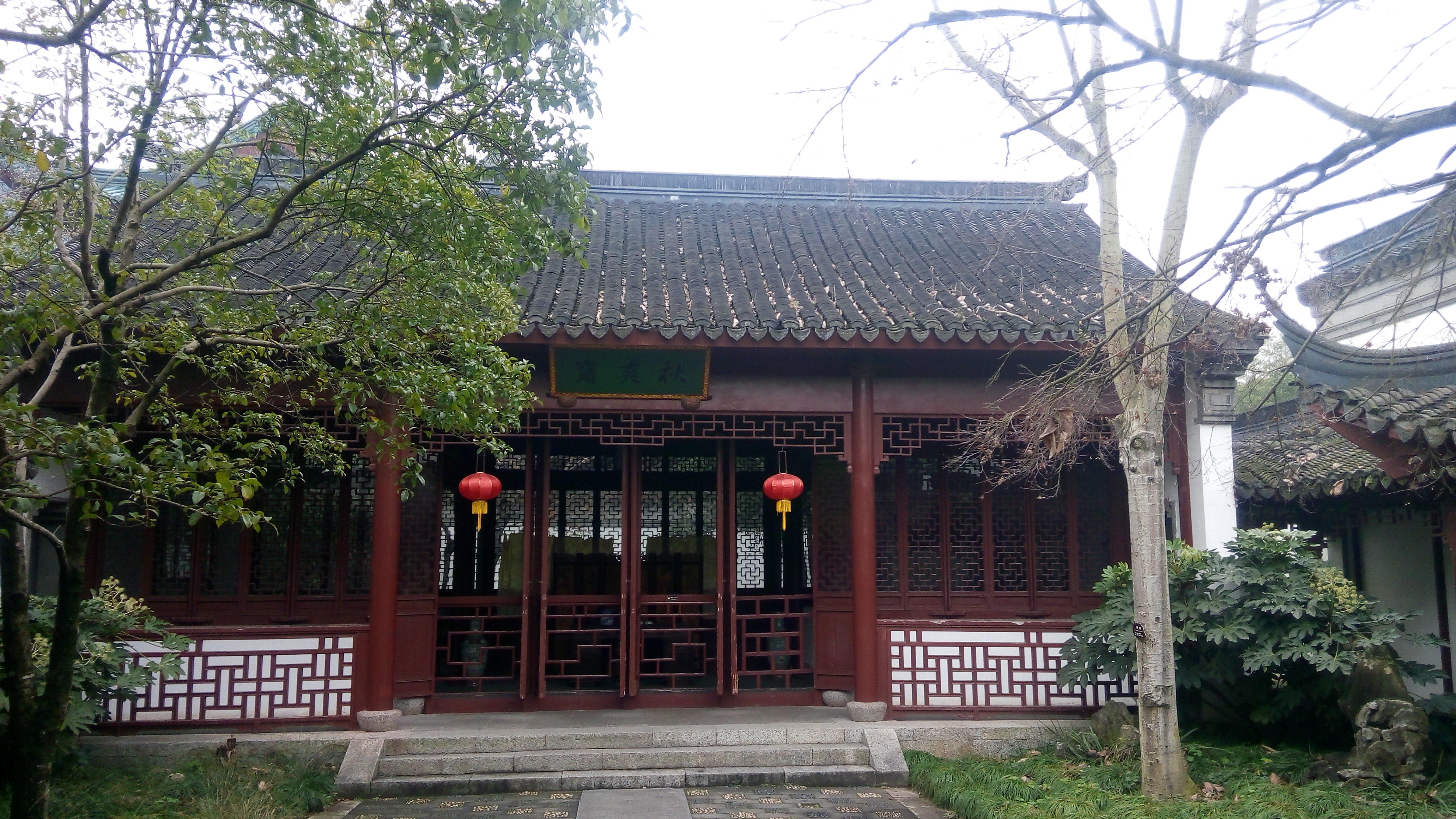 秋爽斋门前东接蜂腰桥,西连荇叶渚,北邻晓翠堂,隔溪与紫菱洲相望。