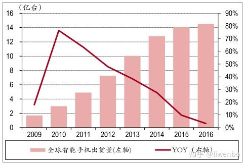上面说的是新零售的概念,那么为什么这个概念最近两年开始火了?这背后的大背景,是因为到2015年底、2016年初整个智能手机出货增速大幅下滑,换言之移动互联网的红利自2016年就结束了。下图为历年全球智能手机出货量情况。