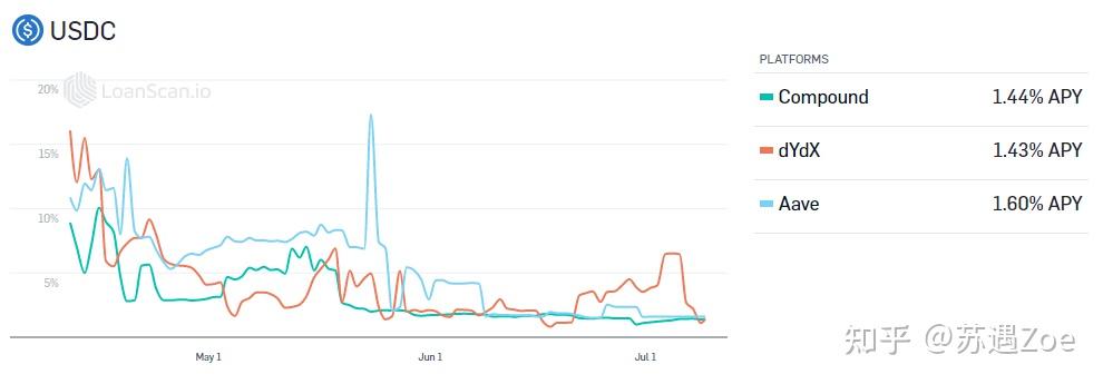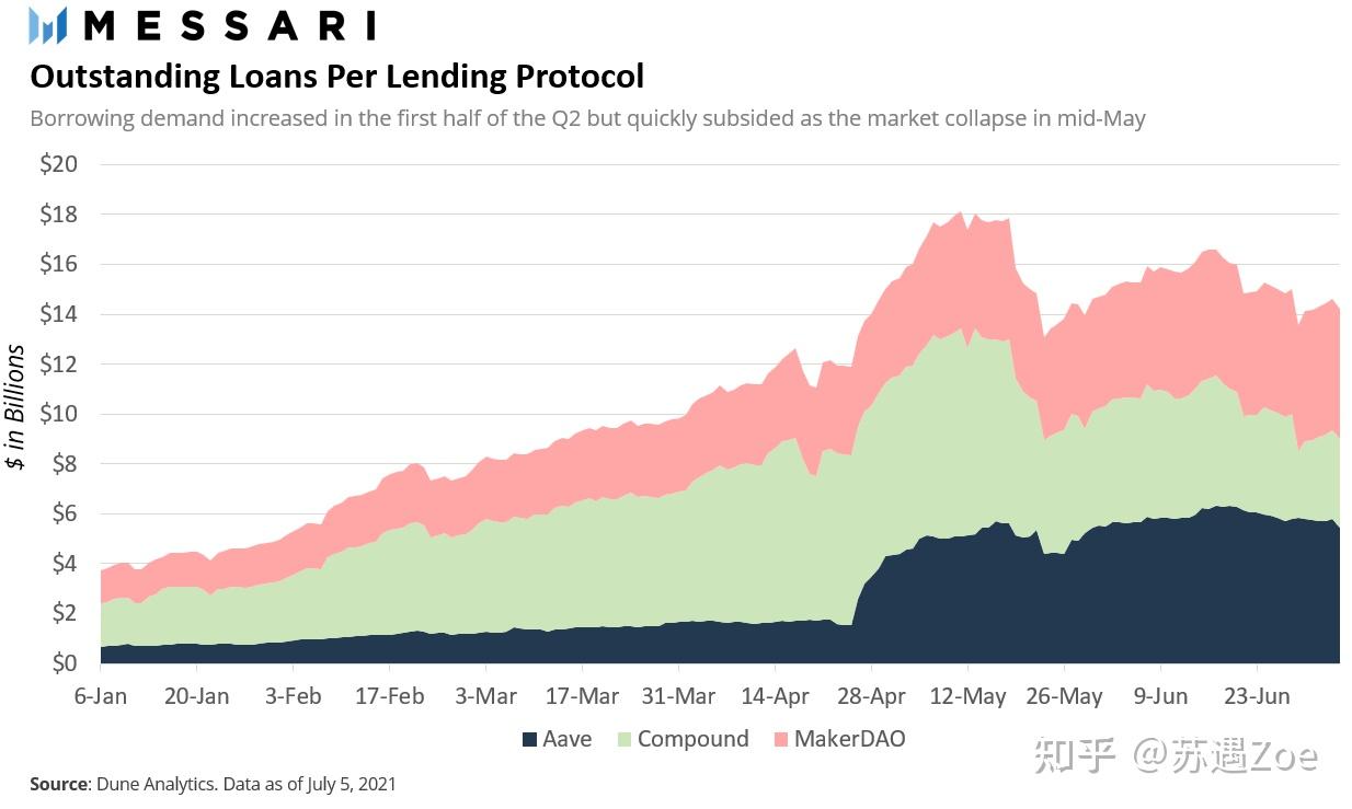 在Polygon的推出和大量代币激励措施的推动下,Aave在未偿还贷款总额中的市场份额在4月份飙升,这让Compound陷入了竞争。到5月底,Aave取代Compound成为领先的借贷平台,占据了DeFi总借贷市场的37%以上。