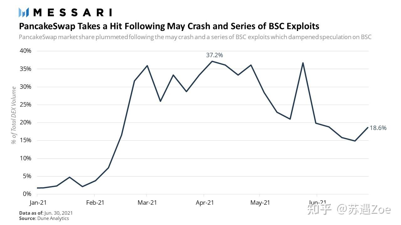 在5月数字货币市场暴跌之后,币安智能链生态系统也受到了严重打击,锁仓量在短短几天内从峰值下跌了50%以上。尽管所有智能合约平台上的锁仓量都收缩了,但币安智能链的损失更大,因为其应用程序中锁定的大部分价值是雇佣资本,并且由除了激励用户投机之外几乎没有用途的资产组成。与混合了大量稳定币的以太坊不同,币安智能链的锁仓量的构成存在较大风险,使其对市场波动极为敏感。再加上币安智能链上的一系列黑客攻击和漏洞问题已经导致出现了数亿美元的损失。此外,币安智能链上的投机活动在6月份急剧枯竭,导致PancakeSwap交易量在6月份下降了69%。其市场份额也同步下滑。
