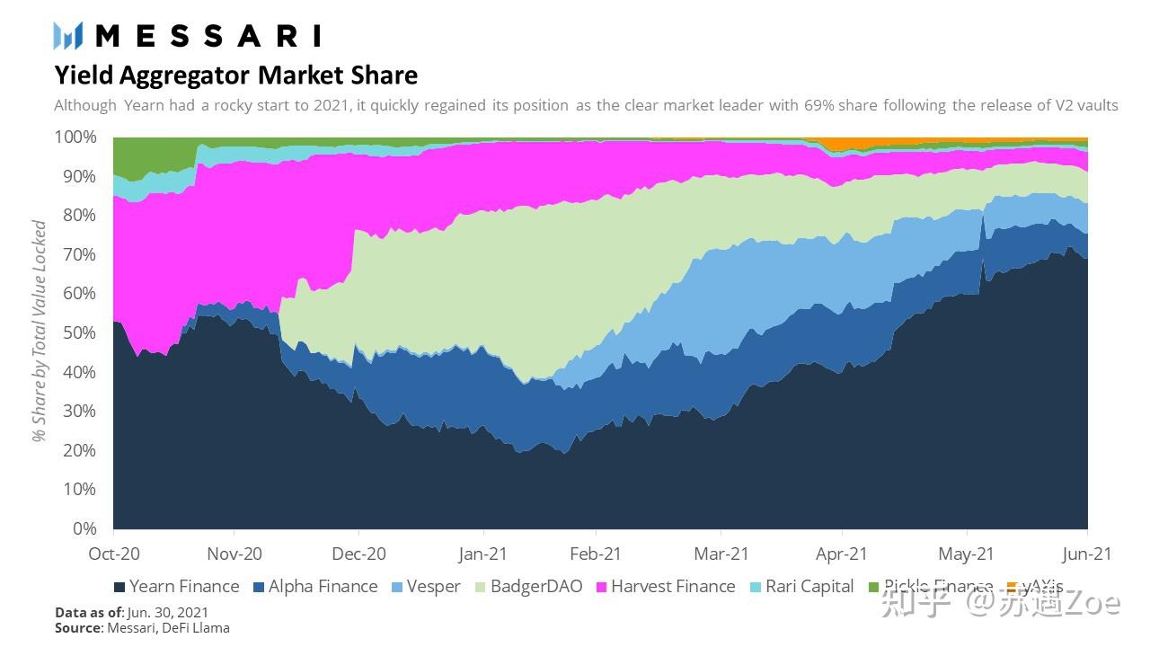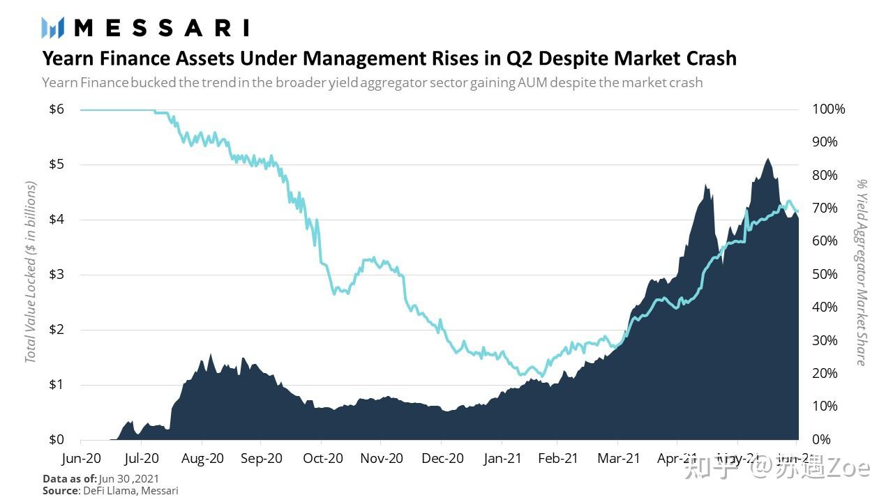 在收益聚合器市场上,二季度值得关注是Yearn的卷土重来和上升,其市场份额在本季度从29%飙升至69%。