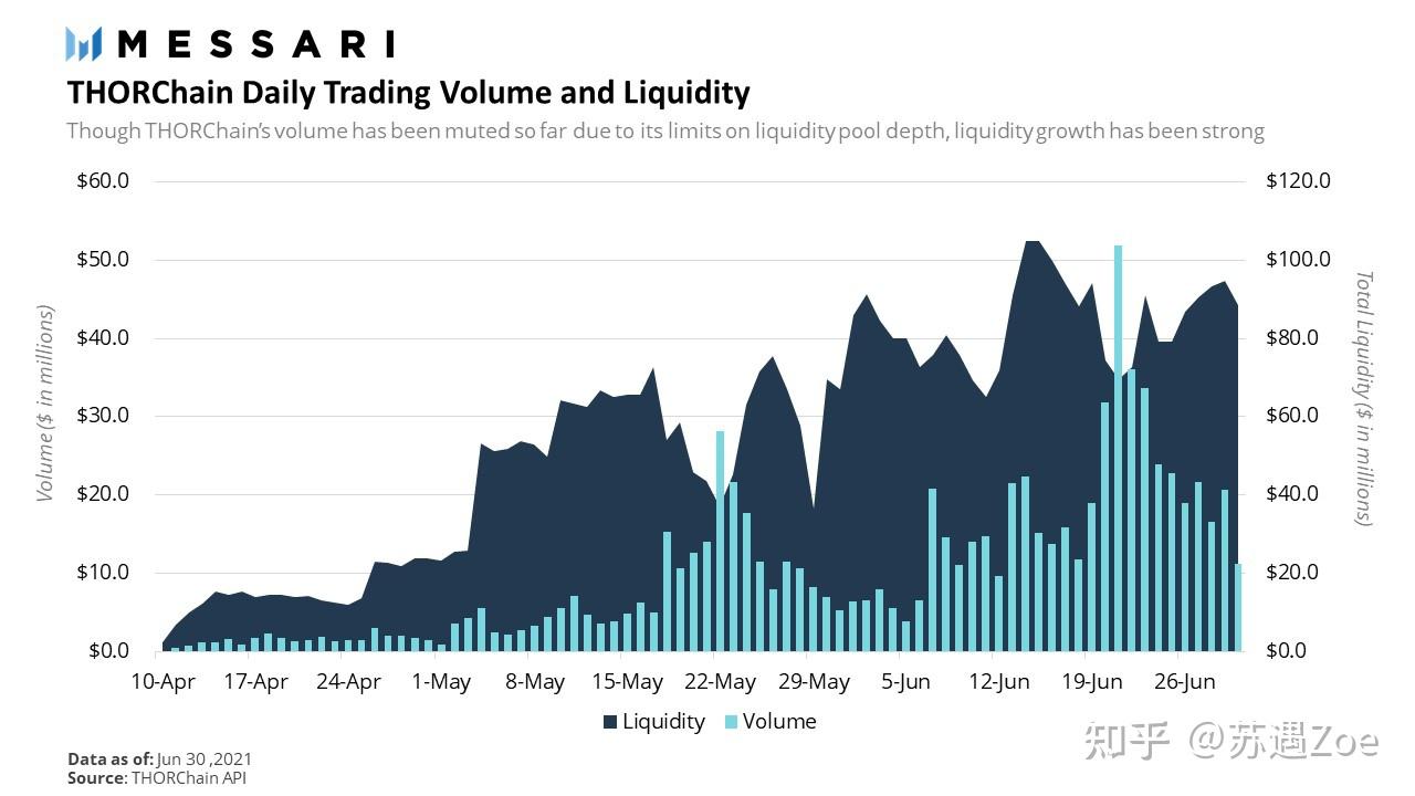经过两年多的开发和多次延迟,跨链流动性协议THORChain终于在2021第二季度首周上线。目前正在以受保护的方式推出,随着网络的发展,社区将逐渐提高流动性池的上限,证明其安全性并解决bug。目前THORChain支持五条链,包括比特币、以太坊、币安链、比特币现金和莱特币,并计划在未来几个月内连接更多区块链。尽管目前THORChain交易量保持低迷,但流动性正随着上限提高而同步增长,这也显示出跨链流动性市场需求越来越大。我们正在进入一个多链未来区块链,像THORChain这样的基础设施可以在没有可信第三方的情况下在公链之间转移价值。