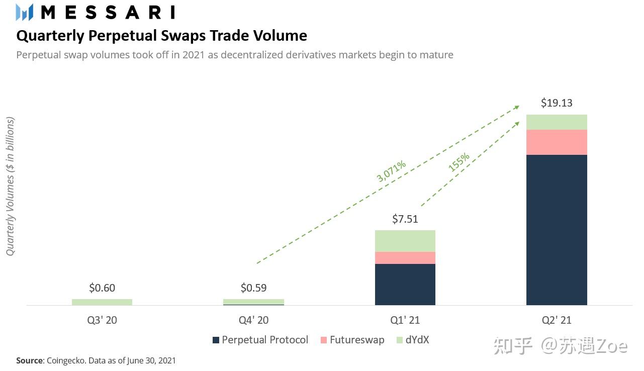 去中心化衍生品交易量在2021年第二季度继续大幅增长,尽管仍然只是去中心化现货交易量的一小部分,但本季度永续掉期合约交易量达到近200亿美元,比2020年第四季度增长了3000%,比2021年一季度增长155%。尽管目前存在扩展障碍,但去中心化衍生协议已经开始受到更多DeFi用户的关注。