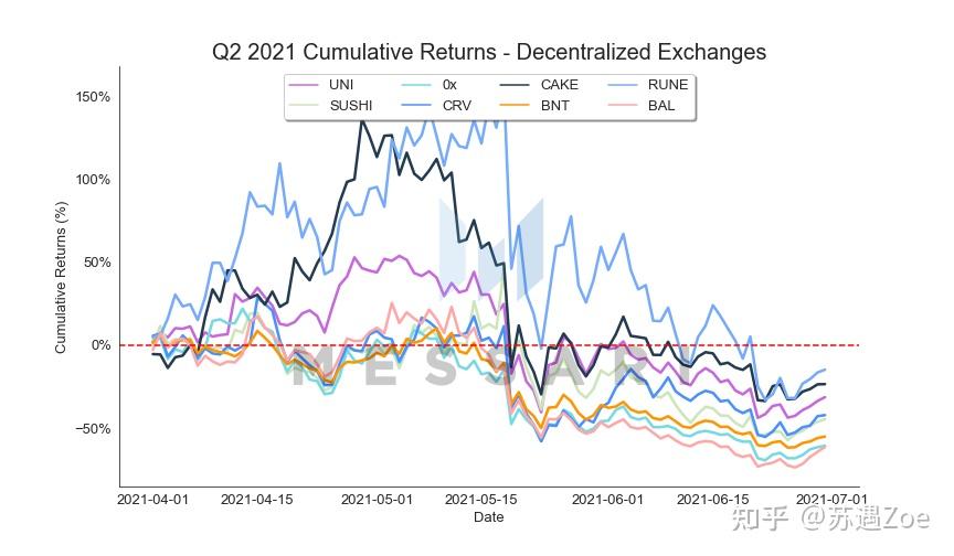纵观整个季度的竞争格局演变,我们看到PancakeSwap的地位发生了相当大的变化。虽然在4月份的短暂时间里,PancakeSwap在数量上颠覆了Uniswap,但由于Uniswap V3的兴起以及5月份之后币安智能链生态系统出现不少问题,导致PancakeSwap的市场份额直线下降。到本季度末,Uniswap每周交易量已经占到DEX总交易的54%,也创下了自2020年11月以来的最高水平。