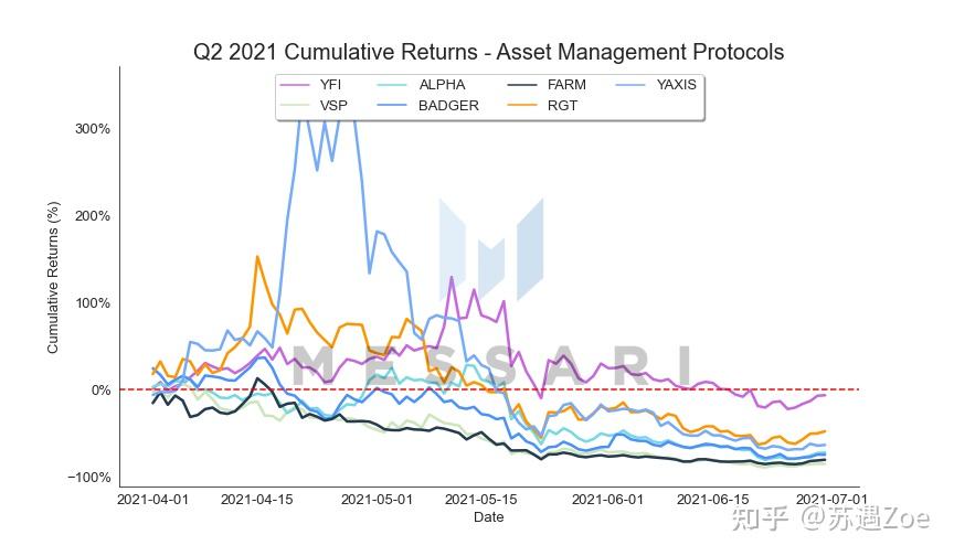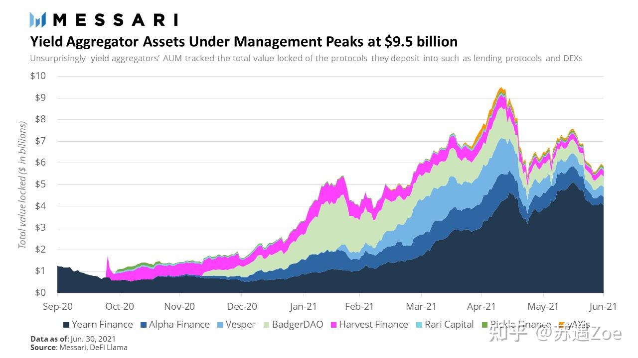不出所料,随着DeFi协议流动性在本季度飙升,将流动性注入DeFi的收益聚合器的锁仓总价值也出现上涨,资产管理规模在第二季度末达到95亿美元的峰值后下降了2%。