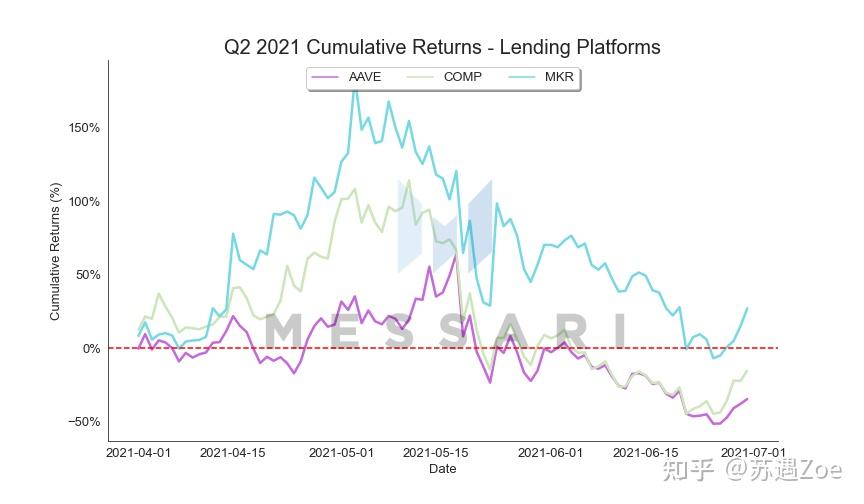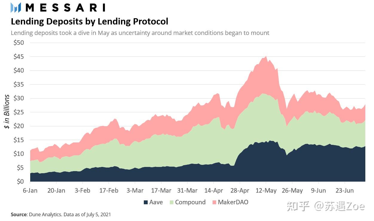 在经历第一季度的繁荣之后,DeFi借贷在第二季度开始降温。然而,2021年二季度依然延续了上一季度的势头。从3月到5月,借贷总额从250亿美元激增至450亿美元的峰值(在短短六周内增长了81%),这主要因为投资者试图捕捉DeFi借贷协议中的高额贷款收益率。然而,随着市场转好,这种上涨趋势突然停止了。在市场动荡加剧的影响下,投资者涌向更安全的资产,导致贷款存款金额暴跌,主要借贷平台锁定的资产总量环比仅增长了15%。