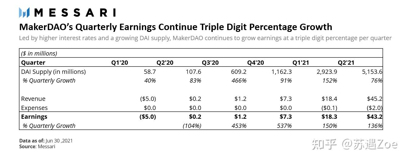 MakerDAO又迎来了一个令人难以置信的季度,DAI供应量增长76%,,收益增长136%。截至二季度末,DAI供应量达到了令人印象深刻的50亿美元,而MakerDAO在本季度产生了4300万美元的收益。