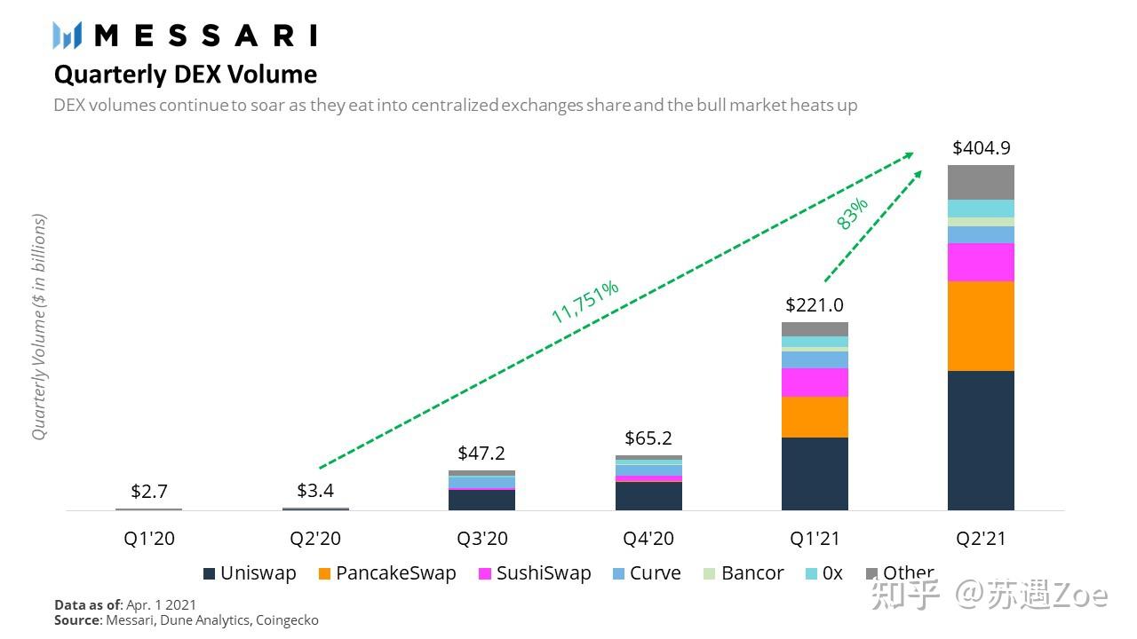 DEX交易量在第二季度继续爆炸性增长,在本季度达到4050亿美元——同比增长117倍,自第一季度以来增长83%。仅5月份就占了本季度交易量的一半以上,出现这种情况并不意外,因为5月份数字货币市场也冲顶了。