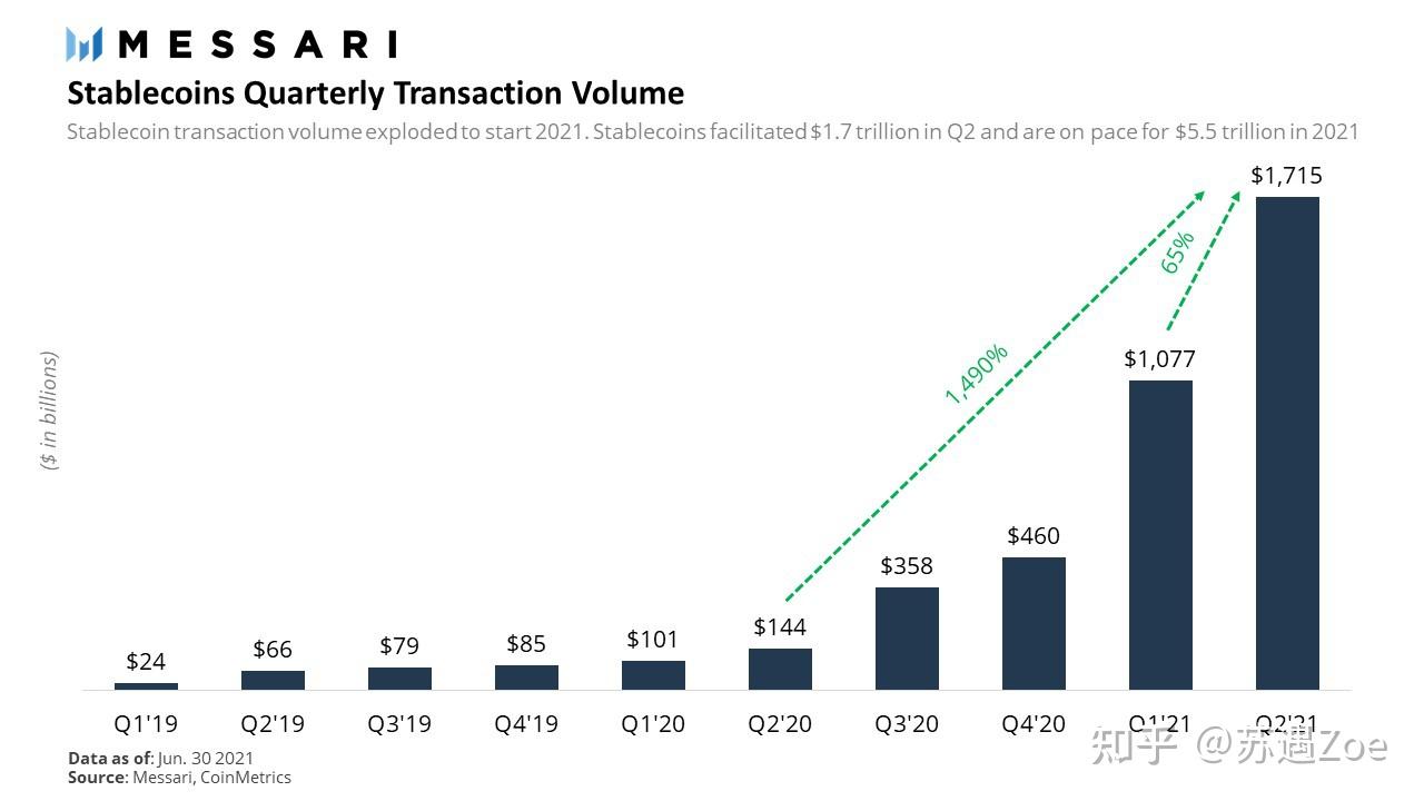 2021年第二季度,稳定币总发行量超过1070亿美元,自第一季度以来增长了70%,同比增长了803%。