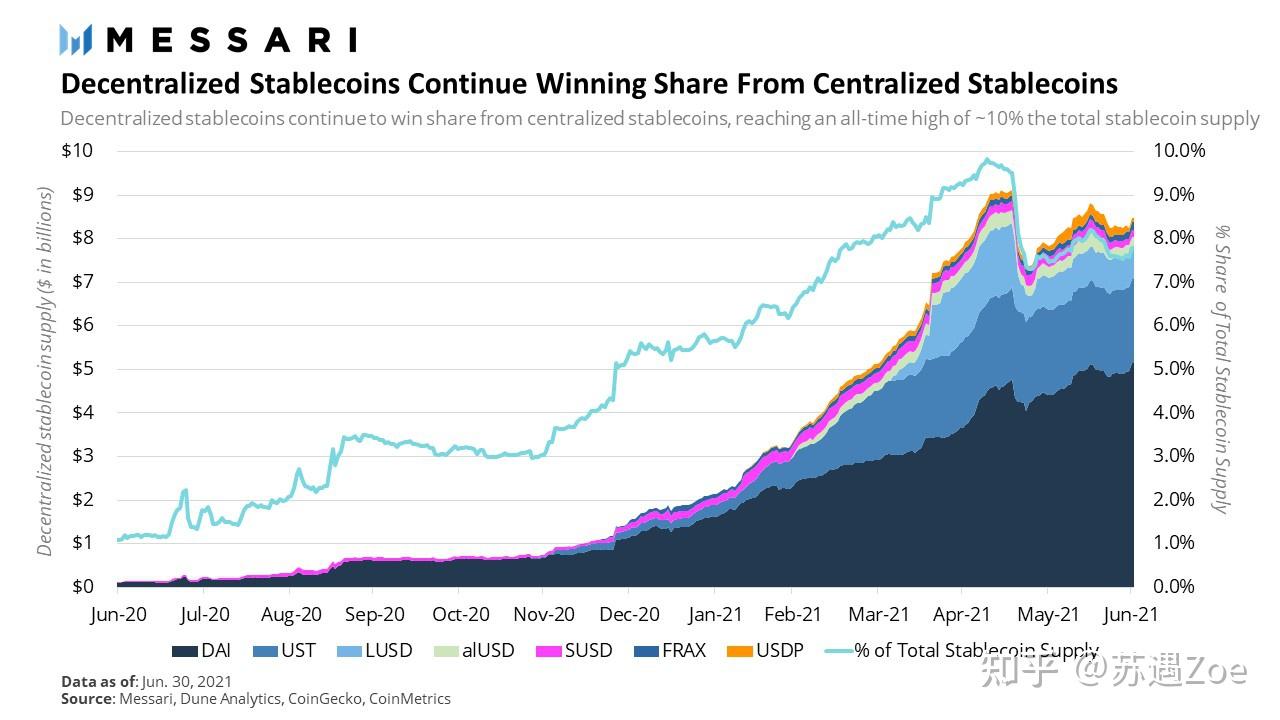最后,我们再来看看去中心化稳定币市场情况。实际上,去中心化稳定币在二季度继续从中心化稳定币中赢得份额,去中心化稳定币已经占到稳定币总供应量的10%左右,创下历史新高。