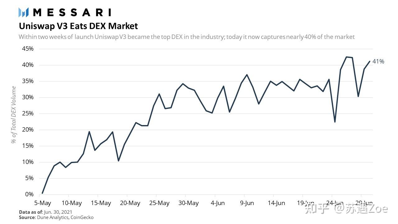 5月,Uniswap终于推出备受期待的Uniswap V3协议,其最大特点是将流动性集中起来——允许流动性提供者(LP)能够在定制的价格范围内做市,并在此过程中创建个人价格曲线。该设计承诺通过使流动性提供者在指定的价格范围内提供与V2相同的流动性深度,同时使闲置资本变得更少,从而将流动性提供者的资本效率提高了4000倍。在短短几周内,Uniswap V3就成为了业内最大的DEX,并在6月份实现了近280亿美元的交易量。