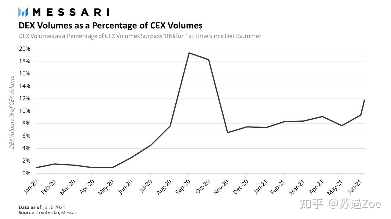 最后,纵观整个DEX市场,我们发现自2020年10月以来,DEX交易量占中心化交易所交易量的百分比首次超过10%。数据显示,随着时间的推移,去中心化交易所正在吞噬中心化交易所的交易量。