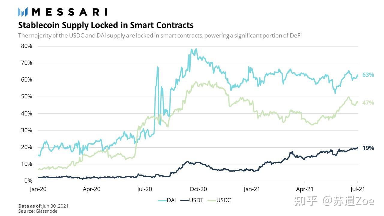 现在超过50%的USDC供应位于智能合约中——相当于约125亿美元。虽然这个百分比没有DAI高,但如果以美元计算,USDC仍处于领先位置。