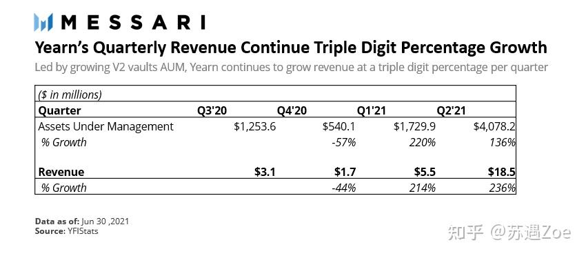 Yearn的收入也与AUM一样出现增长,二季度的收入为1850万美元,比第一季度上涨了236%。