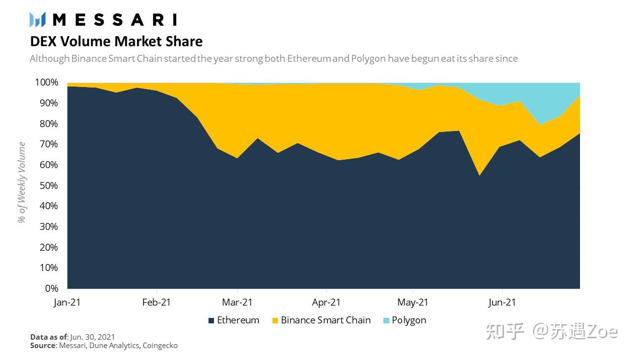 Polygon的崛起也在蚕食币安智能链在去中心化交易量中的市场份额,随着越来越多项目转向Polygon,有了新的通证进行收益耕作,币安智能链被挤出了市场。这种情况很好地诠释了公链之间正在开展的流动性战争,表明通证激励是资本进入区块链生态系统的主要吸引力,一旦激励下降或其他地方的激励更具吸引力时,流动性就会发生转移。