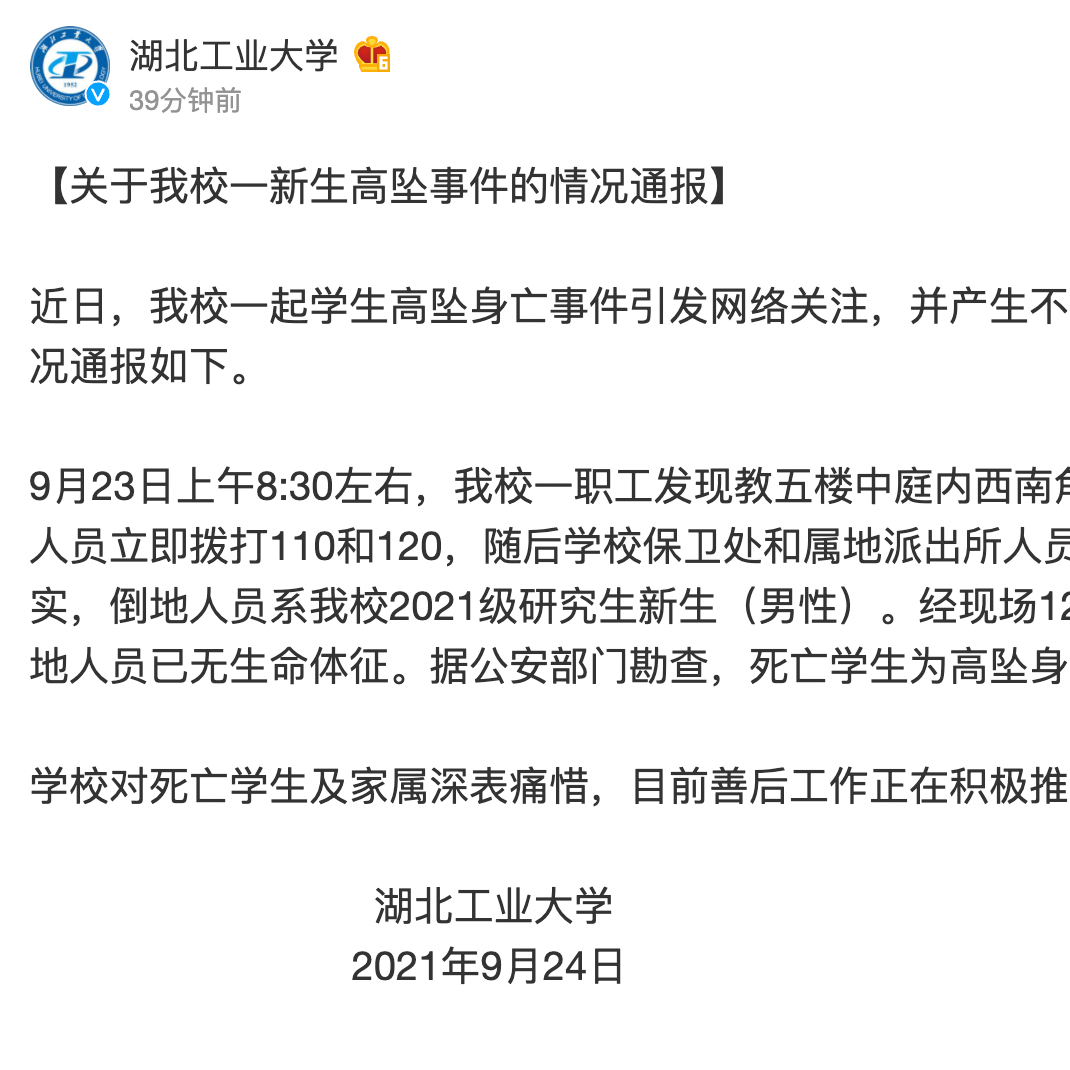 昨天上午一则消息在互联网发酵:9月23日,前天,湖北工业大学研一女生被猥亵,尝试跳楼逃生,结果当场死亡。 [图片] [图片] [图片] [图片] [图片] [图片] [图片] [图片] [图片] 就在坠亡事故发生当天,湖北工业大学宣布国庆节仅放假1天。此事在互联网引发热议,而学生坠亡事件的讨论热度明显下降。 [图片] [图片] [图片] 对于校方宣布国庆节仅放假1天的行为有不少人觉得…… [图片] [图片] 针对此事,有本校生表示: [图片] 还有网友表示:让子弹飞一会儿,相信官方通报。 就在昨天下午,首先是凤凰网发布消息称: [图片] 其后,湖北工业大学官方微…