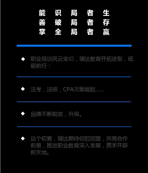 下周,瑞达教育加盟会将召开。但在这之前,相关加盟消息就发出了,酷眩的H5页面非常拉风。