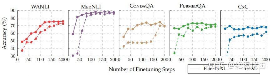 图 5 比较了 T5 模型经过三种不同微调方式的结果。这三种方式分别是T5->Flan->FT、T5->FT、T5->Flan。