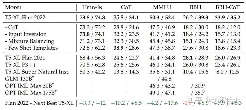 比如,表1中T5-XL Flan 2022 对应的数字 73.8 / 74.8 表示 Flan-T5 XL 在 Held-In 任务上的零样本/少样本准确率。CoT 对应的数字 28.8 / 24.6 表示去掉 CoT 后在 CoT 任务上零样本/少样本准确率。