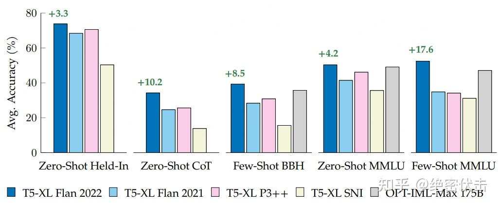 图1展示了不同的公开指令调优集合在三种评估方法上的性能比较,分别是 Held-In(在训练集上的零样本评估)、Held-Out(在 BIG-Bench Hard 和 MMLU 两个未见过的数据集上的零样本评估)、和 Chain-of-Thought(在多个任务之间切换的情境下的评估)。图表中的所有模型除了 OPT-IML-Max(175B)都是基于T5-XL(3B)的,绿色的文字表示相比于下一个最好的 T5-XL(3B)模型的绝对提升。从图表中可以看出, Flan 2022 模型在所有的评估方法上都取得了最好的结果 ,说明它具有很强的指令泛化能力。