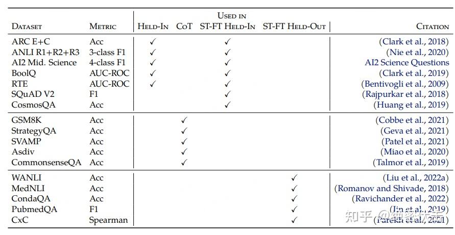 对于 Held-In 评估,使用 4 个问答(QA)任务的验证集,包括 BoolQ、ARC Easy、ARC Challenge 和 AI2 的中学科学考试,以及 4 个自然语言推理(NLI)任务,包括 ANLI R1、R2、R3 和 RTE。这些数据集包含在 Flan 2022 微调集合中,是评估 LLM 在 QA 和 NLI 上的具有挑战性的基准。Held-In 分数是这8个任务的平均准确率。