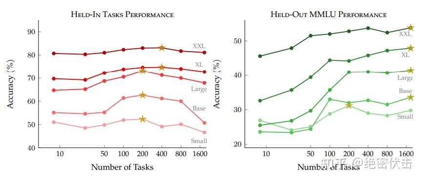 图 4 展示了使用不同大小的语言模型和不同数量的任务来微调语言模型的效果。这里的语言模型是指 T5-LM 这种预训练的语言模型,有 Small, Base, Large, XL, XXL 五种规模。这里的任务是指 Flan 2022 的数据集中的不同任务,每个任务都有一个或多个输入模板,即指示语言模型如何完成任务的方式。图 4 分为左右两部分,左边是Held-In 任务的性能,右边是 Held-Out 任务的性能。Held-In 是指训练时就有的任务,Held-Out 是指训练时没有的任务。图 4 显示了两个结果: