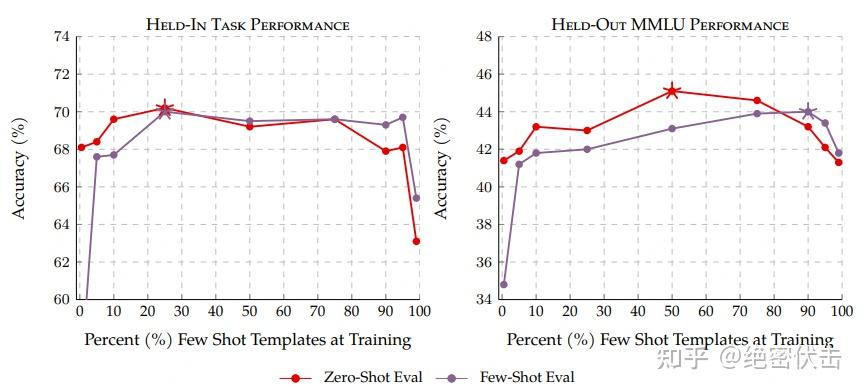 (2)在训练数据中加入一定比例的零样本提示(10%以上)也可以提高少样本评估的性能
