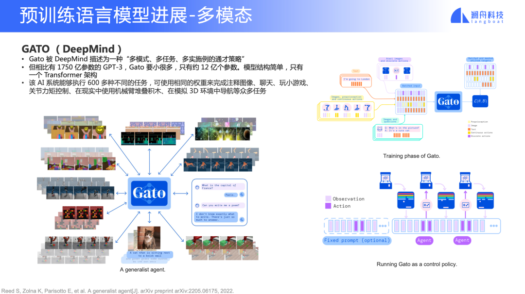 它们都试图把大模型的概念推广到一个相对通用的人工智能领域。 像 Gato,它具备多模态、多任务、多具身的特点,可以玩多种游戏,用一个模型来覆盖多个游戏,而不是说为每个游戏单独训练一个模型。 实际上把强化学习、计算机视觉和自然语言处理这三个领域试图合在一起。