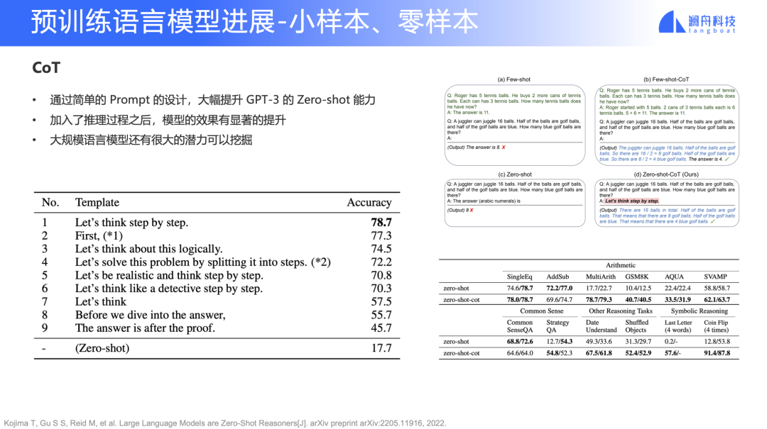 如图 9 左下角的表格所示,在一个任务上,它的 zero-shot 大概是 17.7 分,但是选择“Let's think step by step” 这个 Prompt,分数直接涨到 78 分。