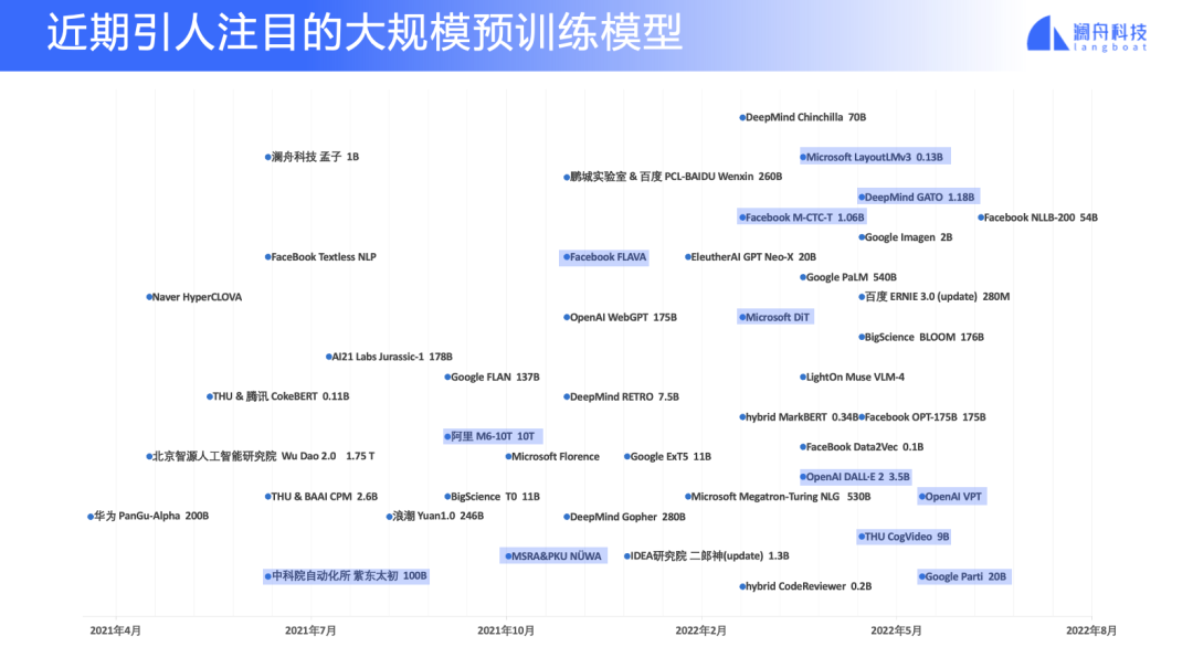 总的来讲,小样本,零样本取得了新的进展,SOTA模型的尺寸在降低,检索增强的预训练模型逐渐成为主流技术。多模态模型能力提高很快,从图、视频、声音、code、甚至扩展到AGI。我们也看到了很多新的应用。