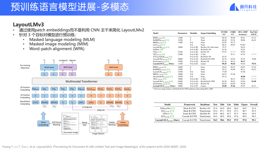 LayoutLM 在文档理解和智能文档领域有非常重要作用,这方面的工作已经推出了第三代。 相比前一代,它用 patch embedding 来代替之前 CNN 的 backbone,使用统一的文本和图像的 mask 任务。