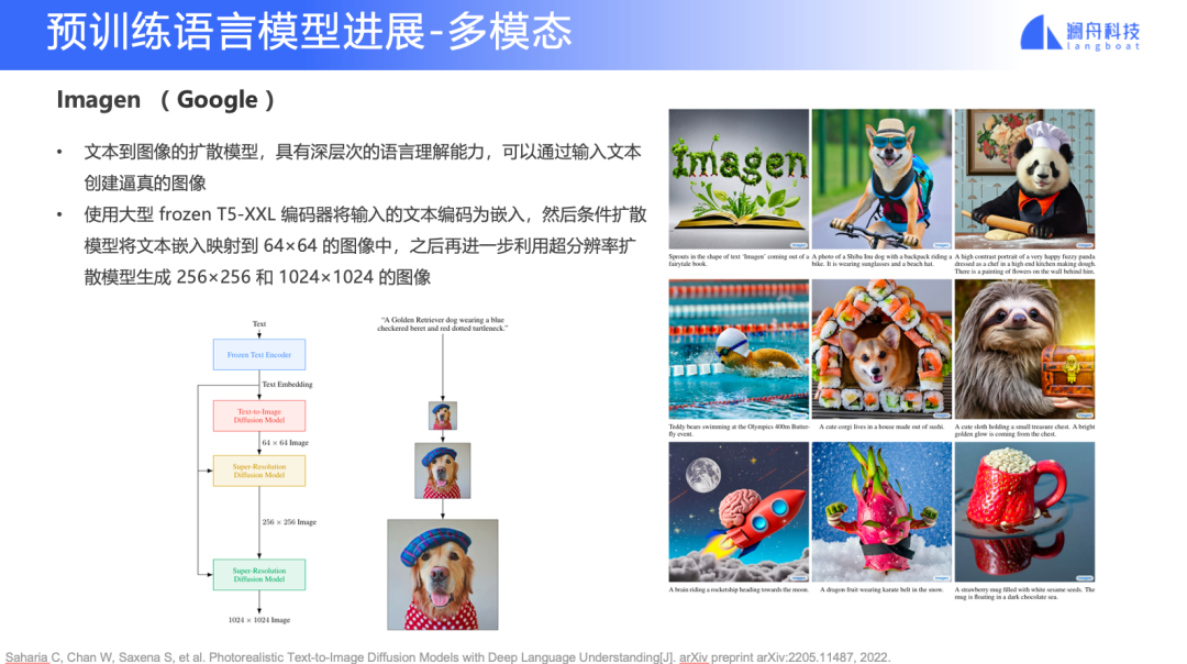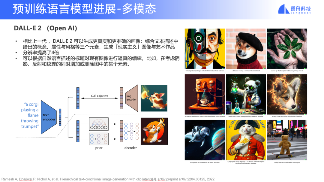 多模态方面近期有很多进展,今年,OpenAI 发布了 DALL·E 2,Google 发布了 Imagen。虽然两个模型权重都未公开,但从释放出的大量示例来看,图片的真实度、分辨率都有较为明显的进步。我们已经到了需要讨论这项技术商业化落地的时间点了。当然,目前模型还存在的各种⻛险和限制也是我们要考虑的问题,比如暴恐、低俗的文字输入、版权⻛险、来自数据的偏⻅等。