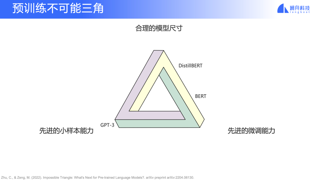 大家可能都知道在分布式系统里有 CAP 定理,该定理指出,对于一个分布式计算系统来说,不可能同时满足“一致性”、“可用性”、“分区容错性”。类似的,去年有一篇论文提出了预训练模型“不可能三角”理论(图6) , 三角形顶端分别是“合理的模型尺寸”、“先进的小样本能力”以及“先进的微调能力”,一个模型很难兼顾这三点,大多数模型只能做到其中一点或者兼顾两点。