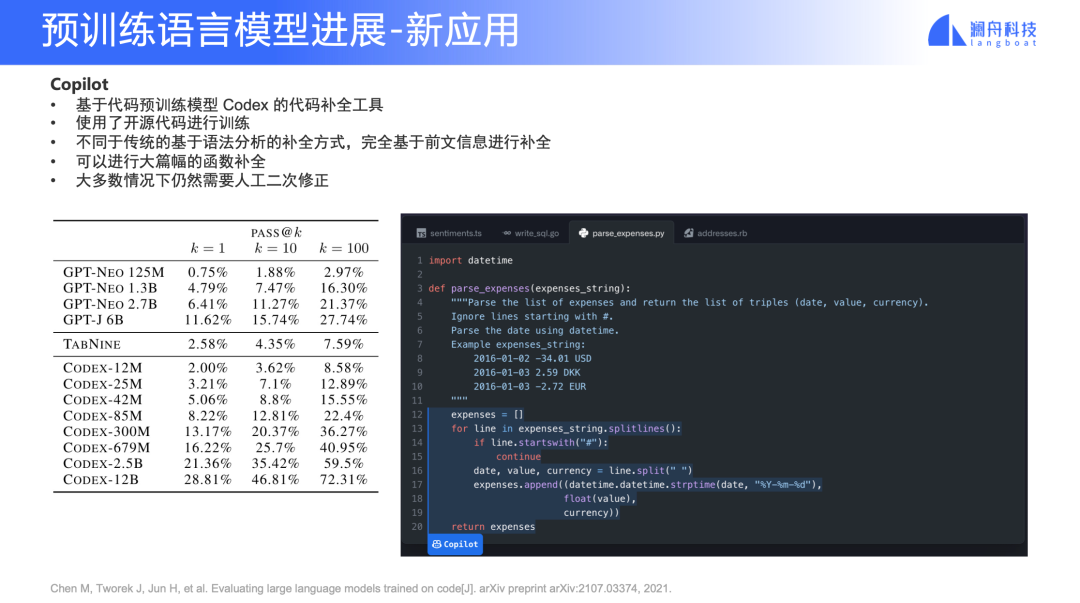 Copilot 已经是非常落地的一个应用了,很多开发者的体验反馈都是“非常惊艳”。传统的代码补全,通常用语法树解析去做预测。由于这个原因,对于解释性的语言的补全做得并不是很好,比如大家常用的 Python。当然,我们也知道有一些厂商做得可能稍微好一点,但相比于 Copilot 这种基于预训练的工具,属于不同“代次”。