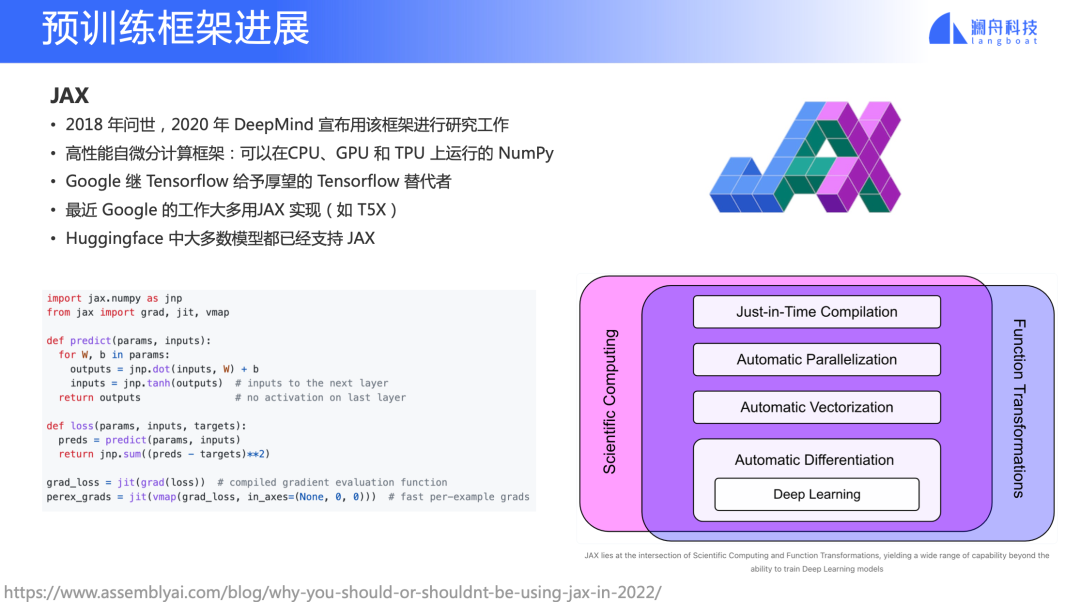 我们更关注的是基于这套框架之上的预训练领域框架,如 T5X,最近 Google的工作很多用 T5X 实现。T5X 跟 Pathway 的思路会很接近,即通过一套框架让研究员很轻松地去调整设置,用不同架构完成预训练。目前在 Huggingface 上大多数模型也都已经有对应的 JAX 版本了。但是这个框架也有一些问题,由于它设计的思路,要求大家用函数式编程的思路写纯函数,那么对大多数没有接触过函数式编程语言(如 Lisp,Haskell 等)的人来说会有一定的上手门槛。