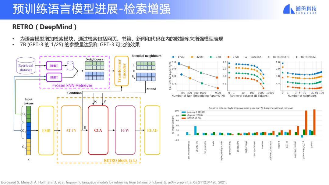 当然 RETRO 也会有一些要求限制。如图 10 左上角所示,它对检索库的数据量有很高要求,在 1T Tokens 左右才能达到相似效果,这也是后续要解决的问题。